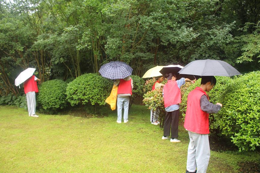 虽然现在是雨季,但同学们依然坚持打伞继续工作,他们依旧以饱满的精神,热情的态度在自己的岗位上工作。通过这次辛苦劳作,白鹭洲公园的花草植物修剪后都得到了一定的改善。