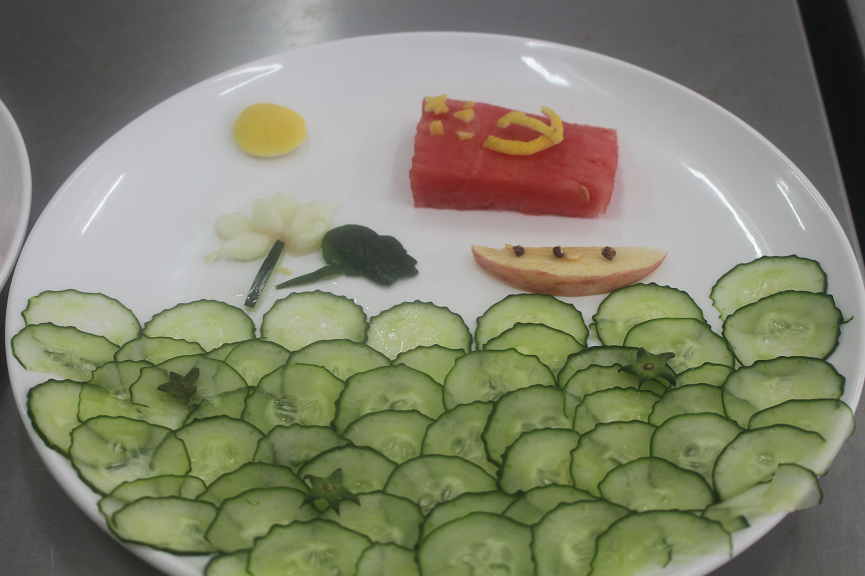 30分钟很快过去,比赛结束。各个小组向评委和观众展示各自作品并讲述了寓意,评委通过“创意、整体造型、色彩搭配、刀工、解说”等多方面对作品进行打分。